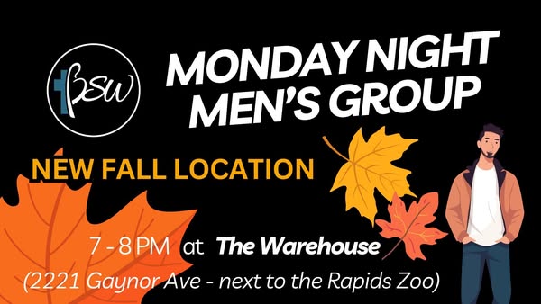Monday evenings from 7-8pm is a time for men to grow their faith and friendships through intentional time in God’s word, prayer, and fellowship. We meet down in the BSW Family Center (UNLESS OTHERWISE NOTED BELOW), so please come to that door (far west door off Baker Street – door opens at 6:45pm).